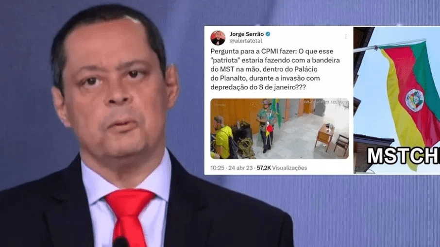 O ex-editor chefe do blog Alerta Total e ex-comentarista do programa 3 e 1, publicou no Twitter: “Pergunta para a CPMI fazer: O que esse ‘patriota’ estaria fazendo com a bandeira do MST na mão, dentro do Palácio do Planalto, durante a invasão com depredação do 8 de janeiro???”, escreveu o bolsonarista, compartilhando registro das câmeras de segurança do local.
