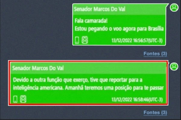 No relatório, a PF registra que a mensagem “causa estranheza”. Em seguida, observa não ter encontrado registros de conversas travadas por Marcos do Val com contatos do exterior e cogita a hipótese de o tal “reporte para a inteligência americana” ser um mero blefe: “Mesmo havendo contatos com números americanos (DDI +1) no celular do senador não foram encontradas mensagens no aplicativo WhatsApp que se referissem ao compartilhamento da ‘missão’ com qualquer contato. É possível que DO VAL tenha dito (sic) tal afirmação apenas como um ‘blefe’”.