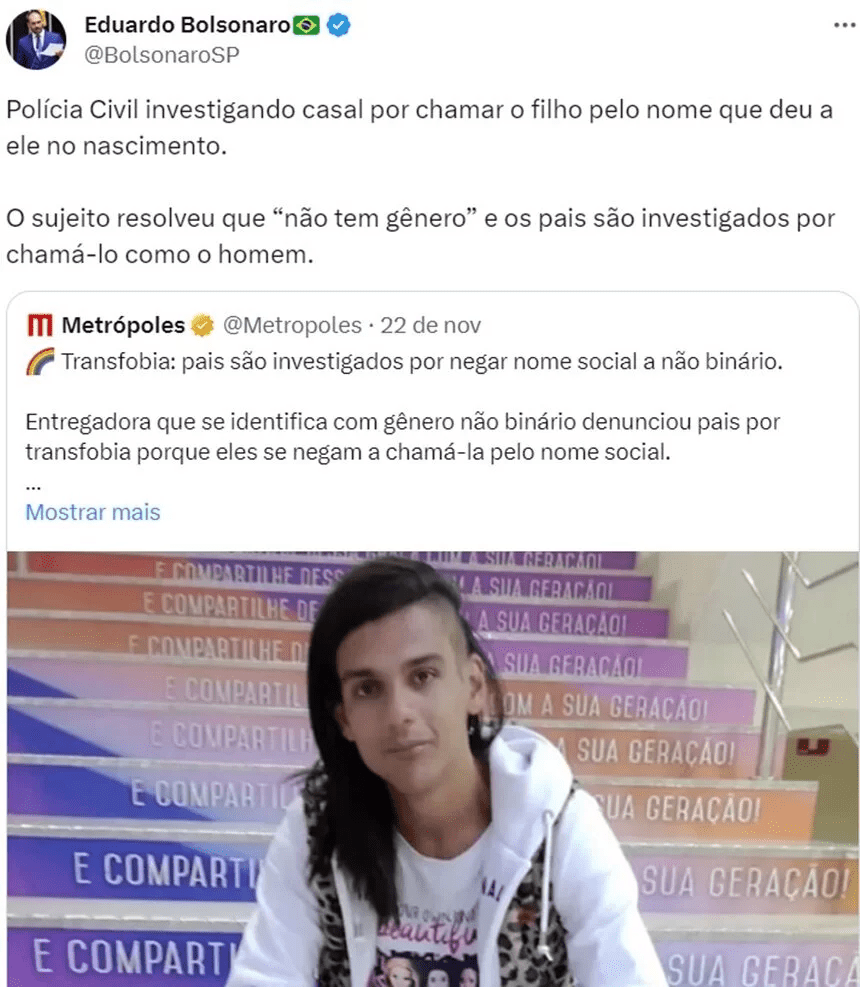 “Polícia Civil investigando casal por chamar o filho pelo nome que deu a ele no nascimento. O sujeito resolveu que ‘não tem gênero’ e os pais são investigados por chamá-lo como o homem”, escreveu o deputado