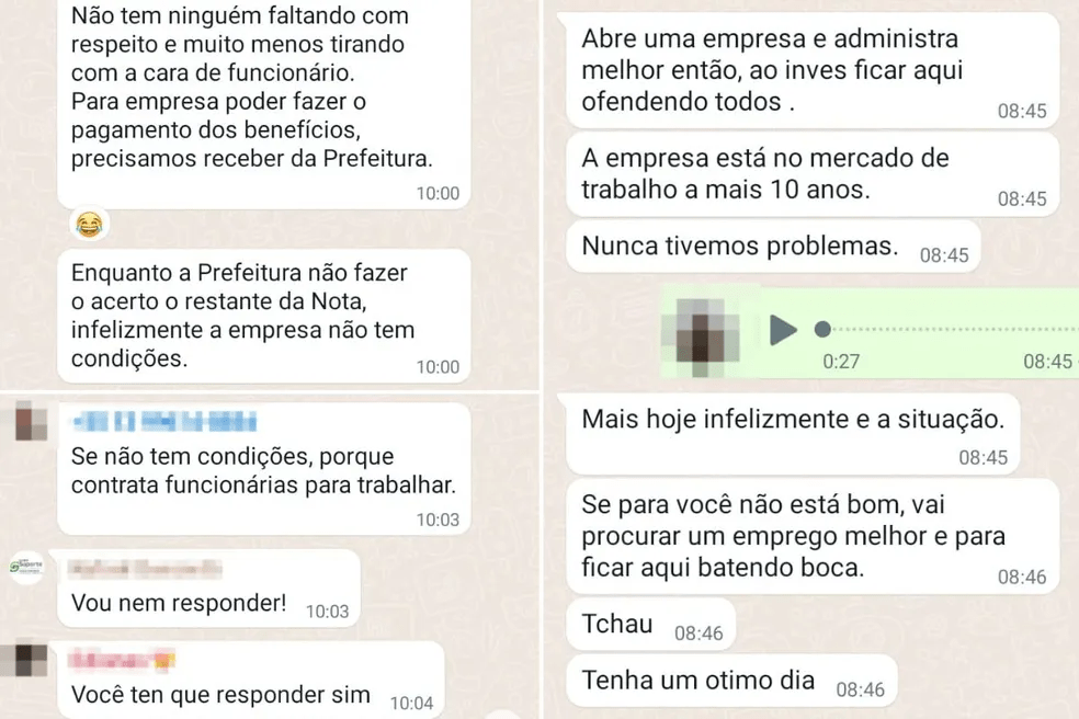 Com as restrições no grupo de WhatsApp, o funcionário do RH passou a receber mensagens dos trabalhadores. Em uma dessas conversas, o representante do setor de Recursos Humanos da terceirizada ameaçou demitir uma funcionária se ela continuasse reclamando.