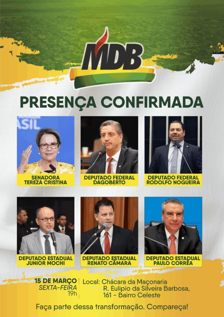 O MDB de rio brilhante, realiza nesta sexta-feira, 15, seu encontro com lideranças políticas e com correligionários locais e também do estado. Já estão confirmadas as presenças da Senadora Tereza Cristina (PP), Deputado Federal Dagoberto Nogueira (PSDB), Deputado Federal Rodolfo Nogueira (PL), “O GORDINHO DO BOLSONARO”, Deputado Estadual Junior Mocchi (MDB), Deputado Estadual Paulo Correa (PSDB), e Deputado Estadual Renato Câmara (MDB).