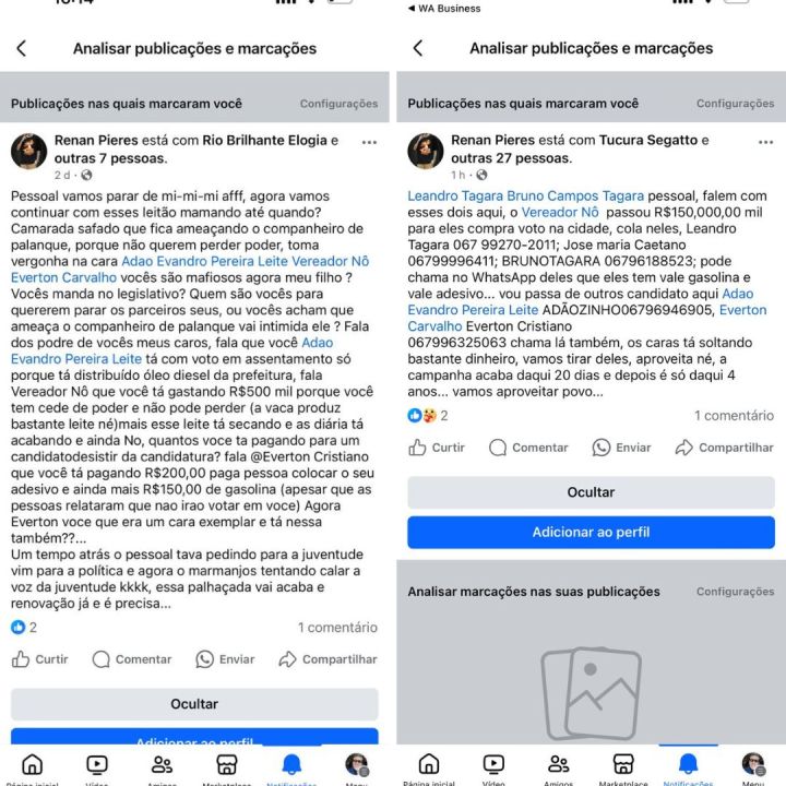 Em uma postagem o perfil afirma que o ex-presidente da câmara,vereador Nô, teria dado um terceiro a quantia de R$150 mil para que esta pessoa “comprasse votos”, enquanto que em uma outra publicação, existe a afirmação de que o parlamentar que tem 7 mandatos como vereador, estaria “gastando R$500 mil para se reeleger” . Na mesma postagem, o perfil afirma que o vereador Adão Evandro “estaria com votos em assentamento, porque estaria “distribuindo óleo diesel”. Na postagem, o perfil ainda afirma que o presidente do PSDB, vereador Everton Cristiano, estaria pagando a quantia de R$ 200 reais para pessoas adesivarem seus carros.