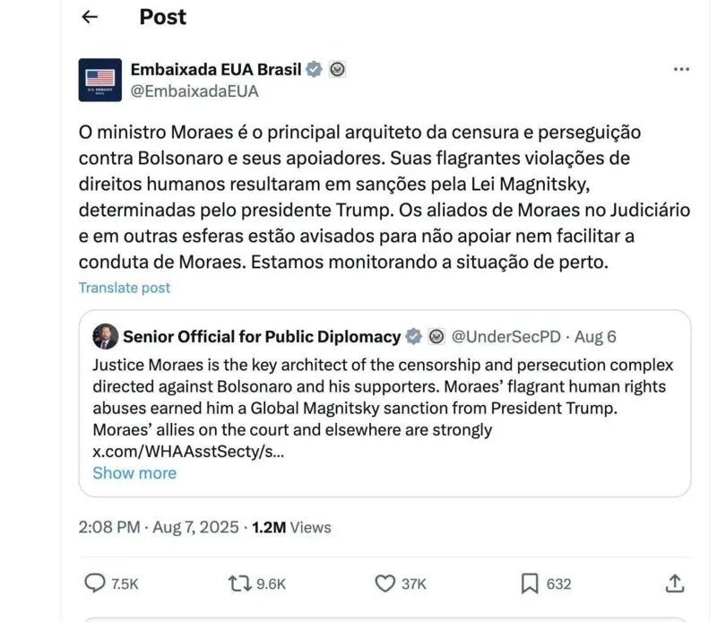 A ação foi anterior à postagem no Twitter com ameaças explícitas a Moraes, em que a Embaixada dos EUA afirma estar “monitorando de perto” a situação no Brasil