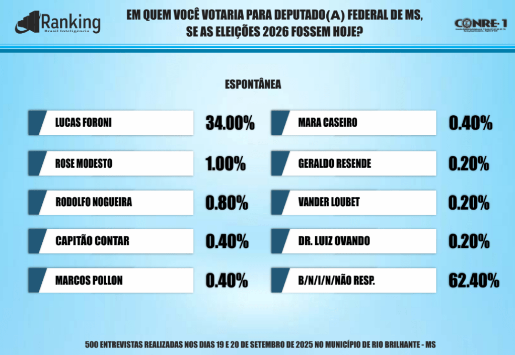Em levantamento realizado pelo Instituto Ranking Comunicação e Pesquisa nos dias 19 e 20 de maio de 2025, o atual prefeito de Rio Brilhante, Lucas Foroni, aparece como o nome mais lembrado pela população para ocupar uma cadeira na Câmara dos Deputados nas eleições de 2026. A pesquisa espontânea, feita com 500 moradores do município, revela que 34% dos entrevistados votariam em Foroni para deputado federal, caso a eleição fosse hoje.